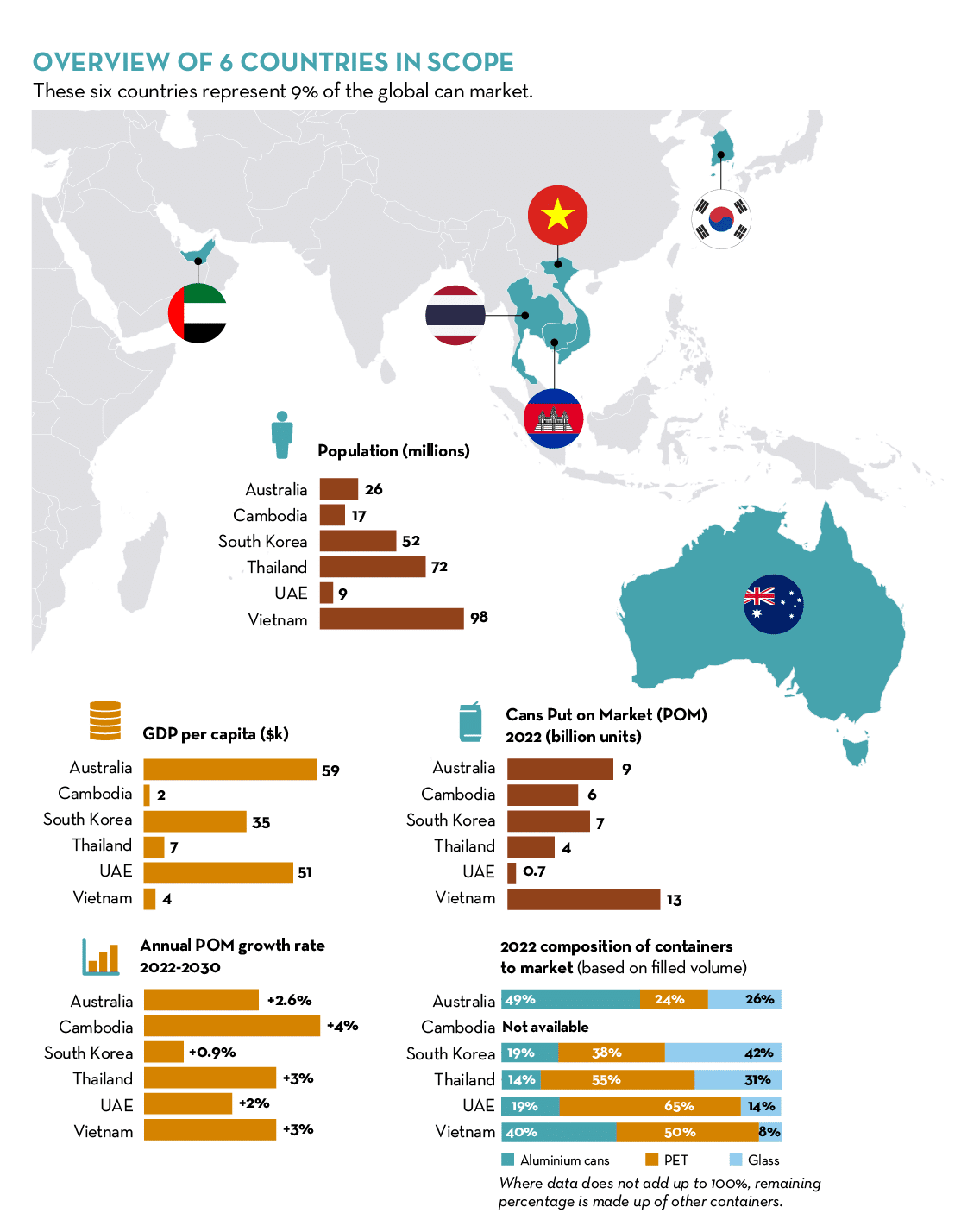 For each of the six countries, various aspects were analysed, including:Waste management and regulatory schemes; Collection infrastructure; Recycling and landfill rates; Volumes on market; Usage trends; Overall performance; Used beverage can trade; Material flows; Future recycling targets