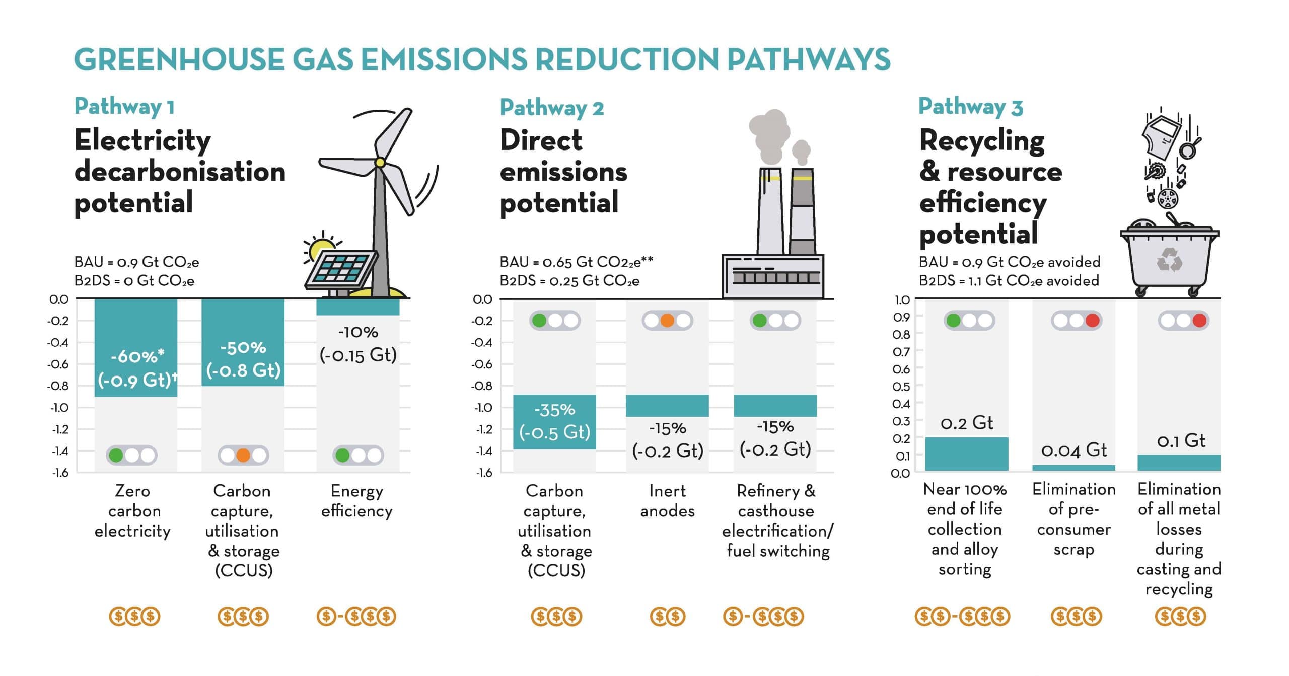 Electricity decarbonisation – Emissions from fuel combustion make up 15% of the industry’s emissions. Here, electrification, fuel switching to green hydrogen and CCUS offer the most credible pathways. Process emissions make up a further 15% and require new technologies, such as inert anodes. These emissions and those in transport and raw materials will need to be reduced by 50-60% from a Business as Usual (BAU) baseline scenario by 2050.