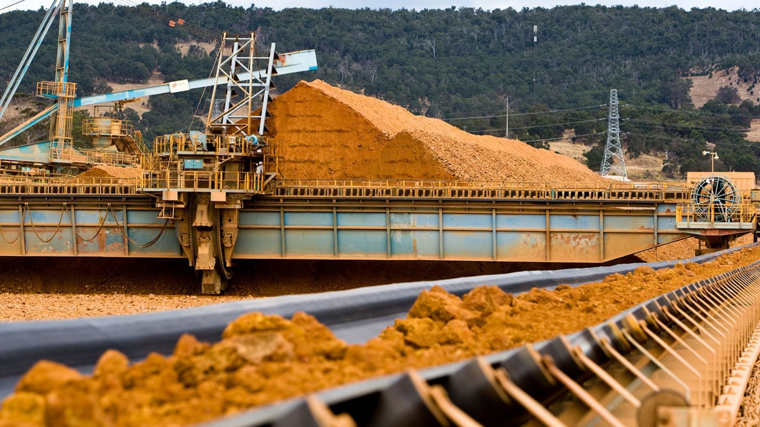 A mining site with machinery processing large amounts of earth material. Conveyor belts transport the mined material, and a large pile of excavated earth is visible in the background. The International Aluminium Institute oversees operations here. Hilly terrain and forested areas are in the distance under a cloudy sky.